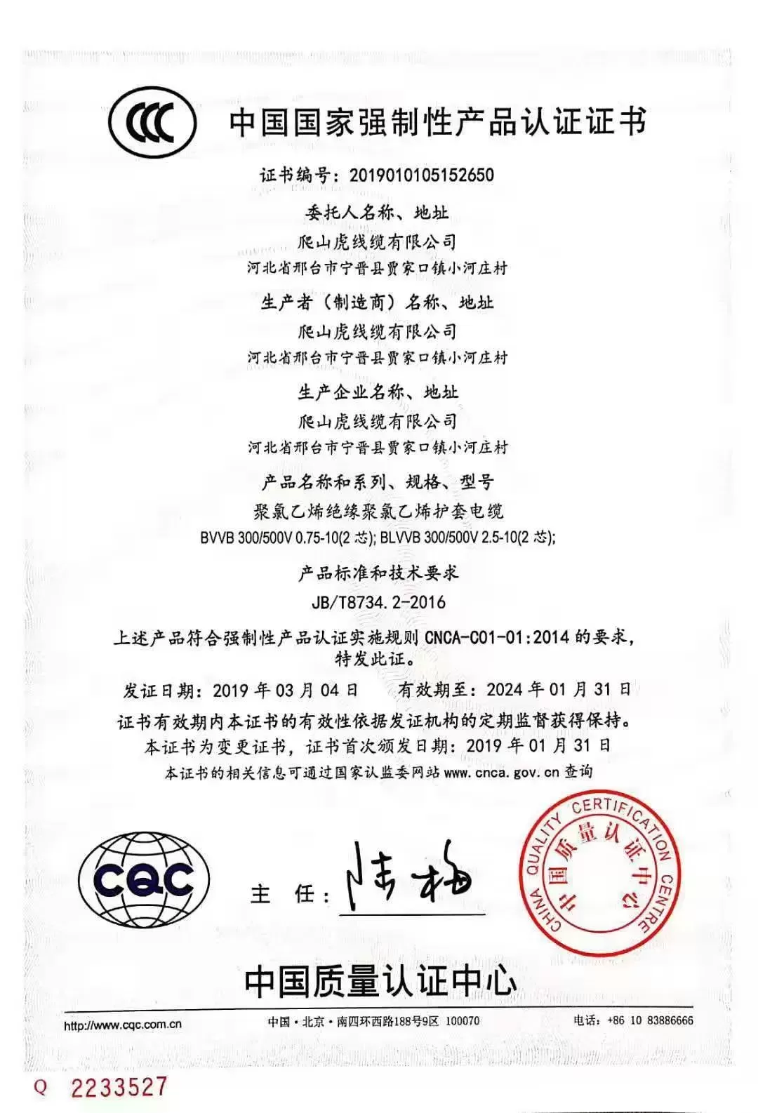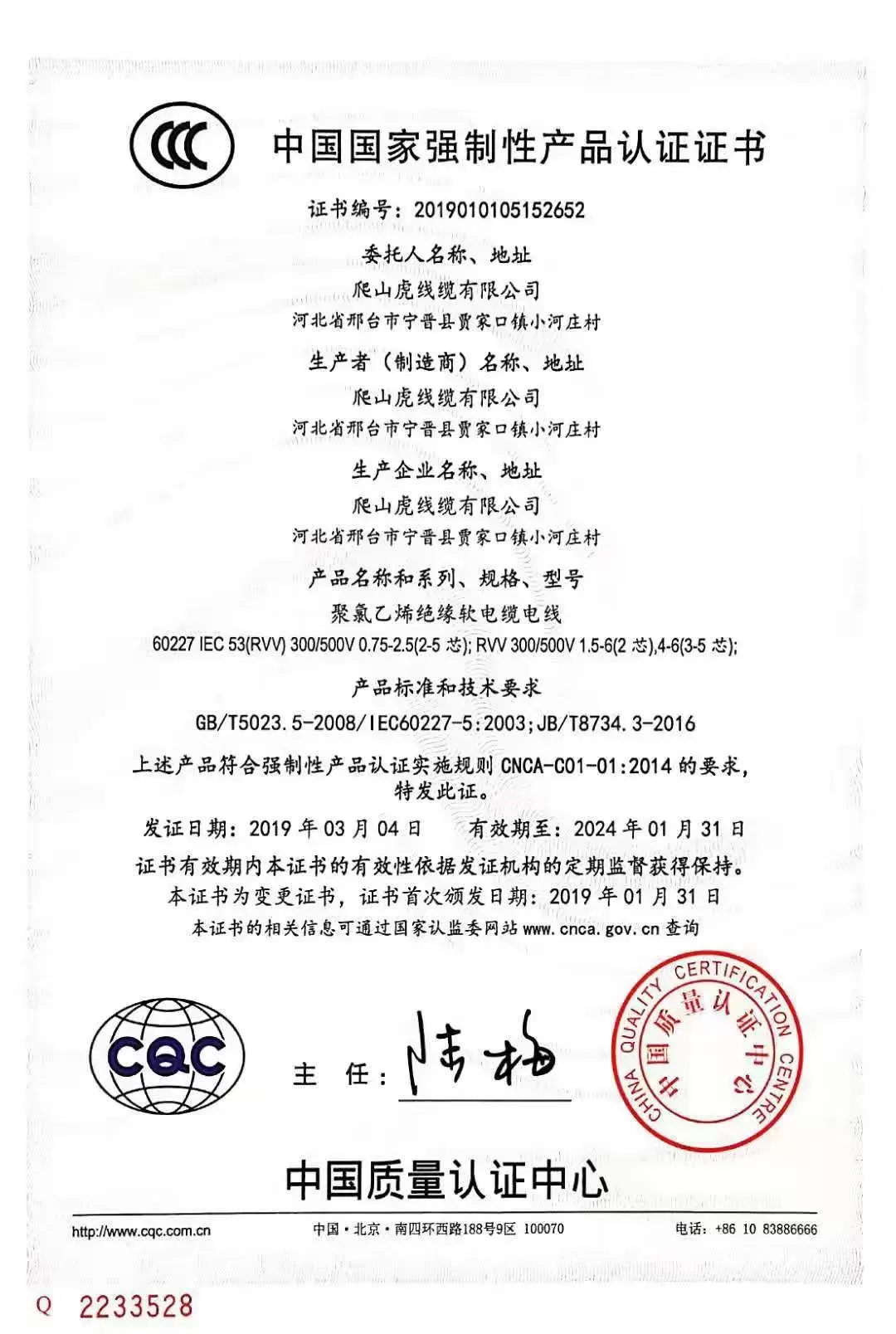 爬山虎线缆公司产品3C质量体系认证书